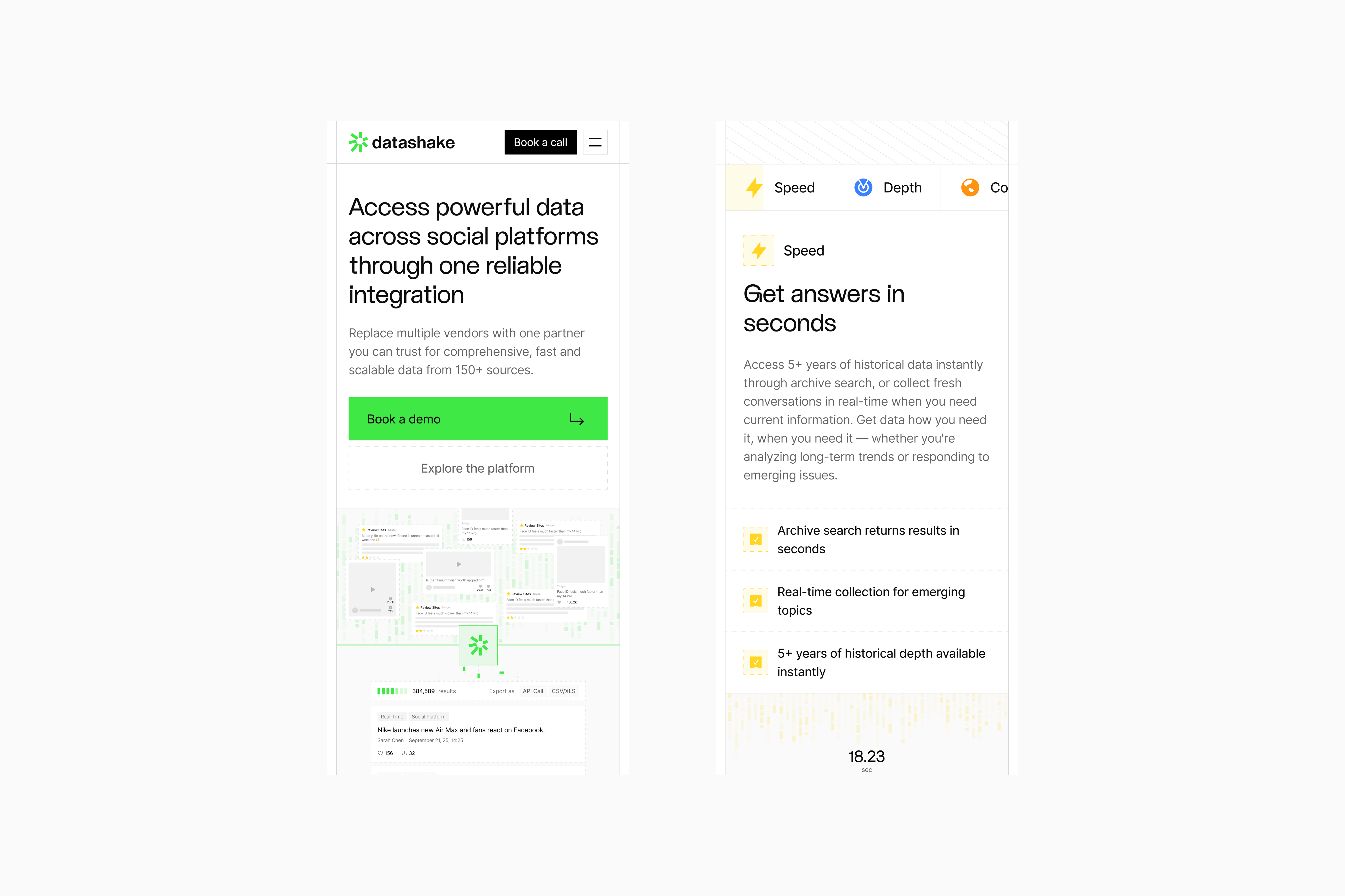 The web design focused on showcasing the product itself. We designed custom product visual animations that demonstrate the platform's depth and speed without overwhelming users. Clean layouts, strategic use of whitespace, and a clear information hierarchy make it easy to understand what Datashake does and why it matters.