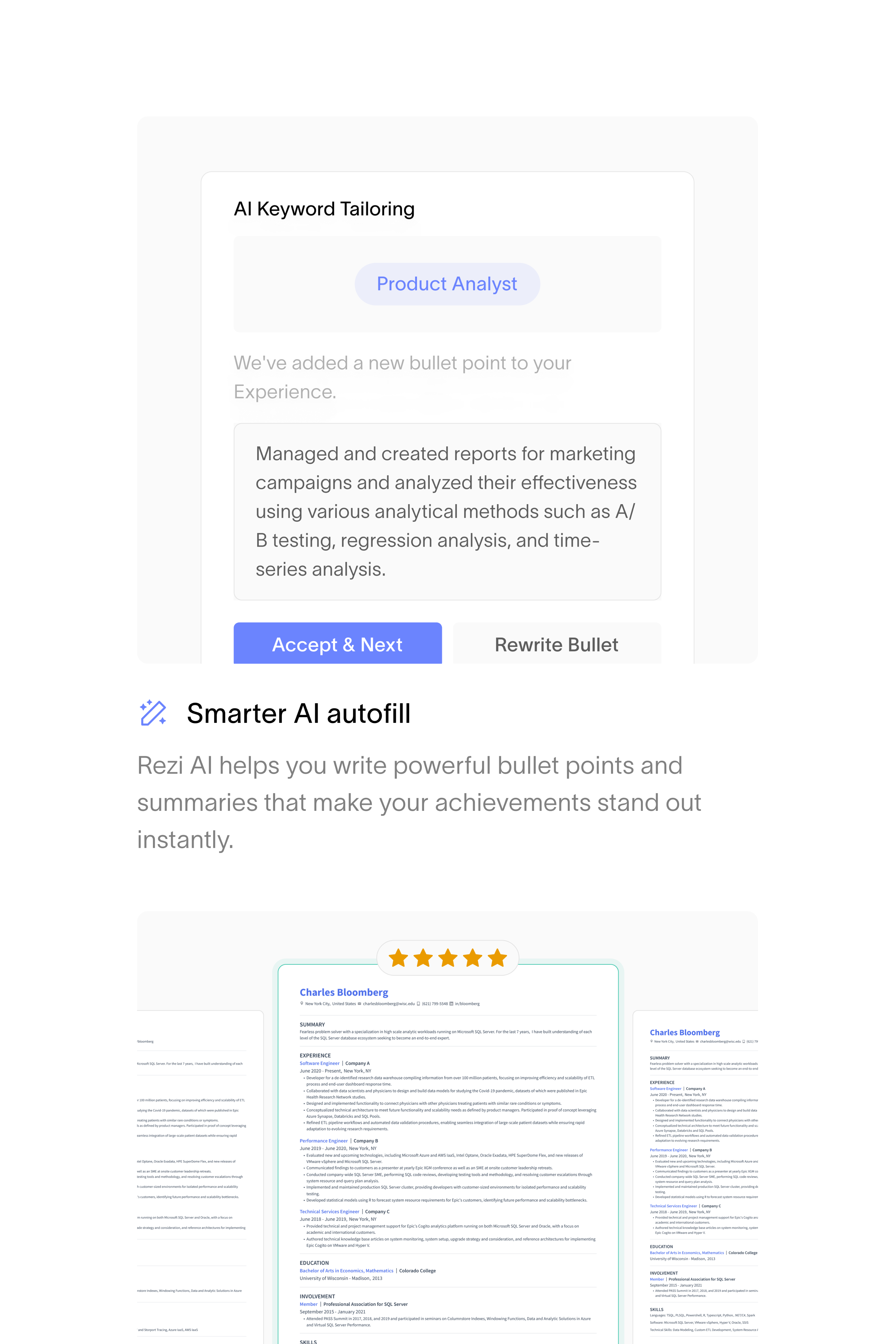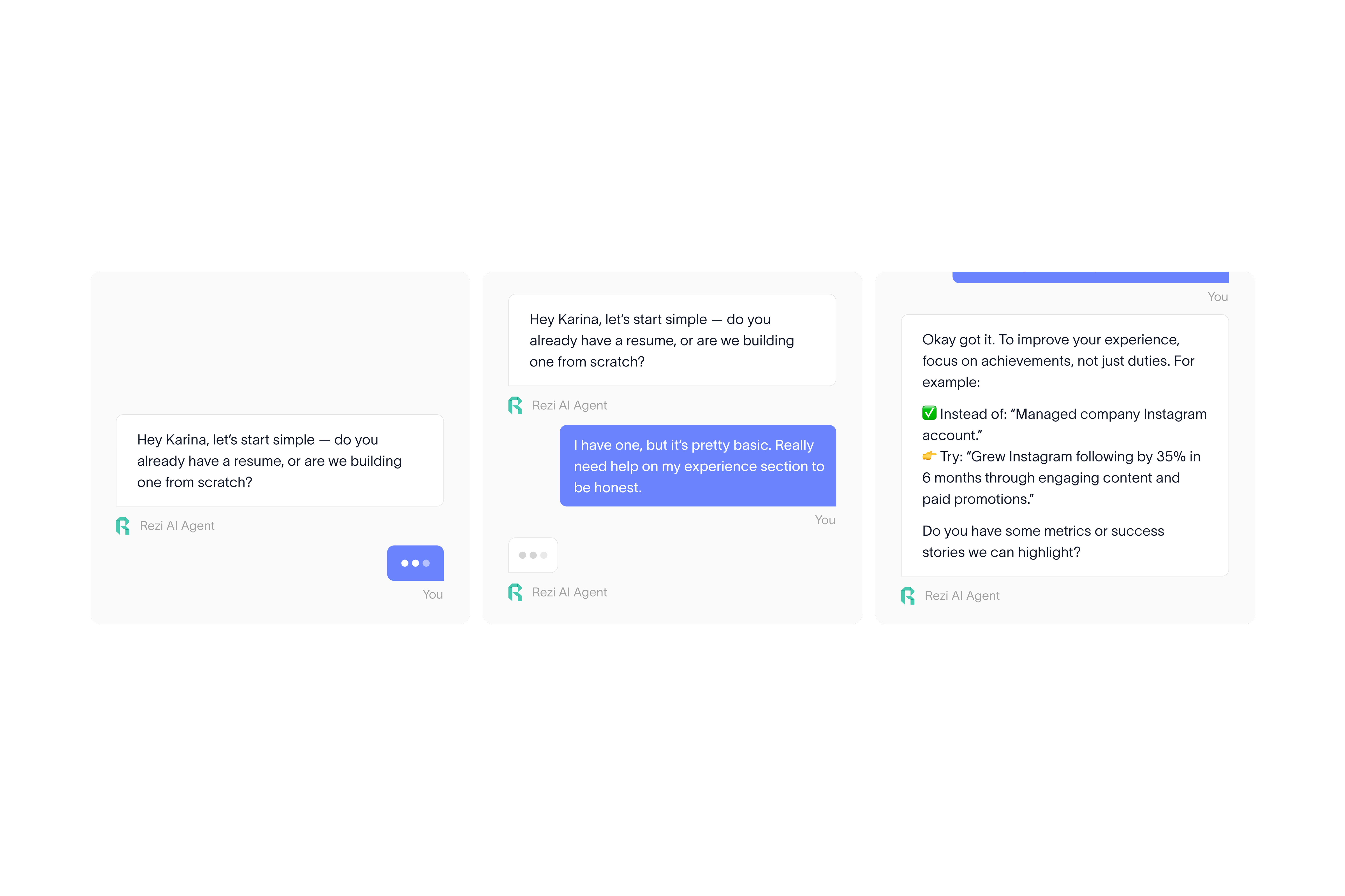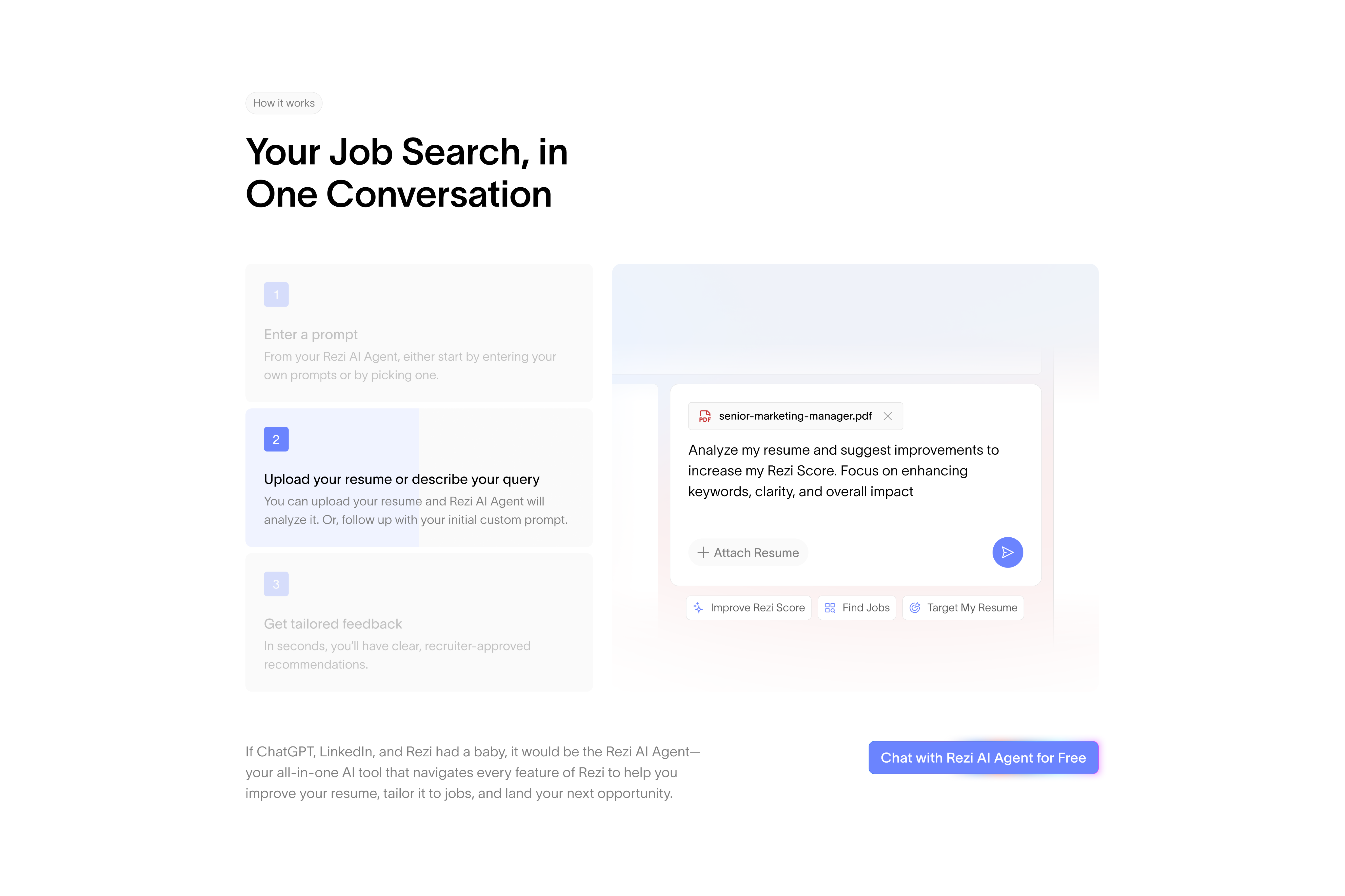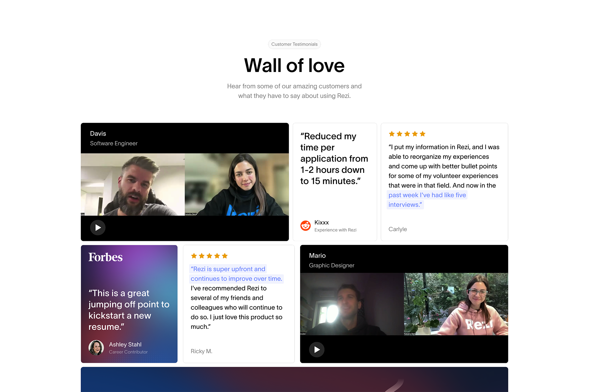 Clean layouts, deliberate pacing, and strategic use of social proof (testimonials, user stats) reinforce trust throughout the experience. The site now positions Rezi as the professional, credible tool it is, built for people who are serious about getting hired.