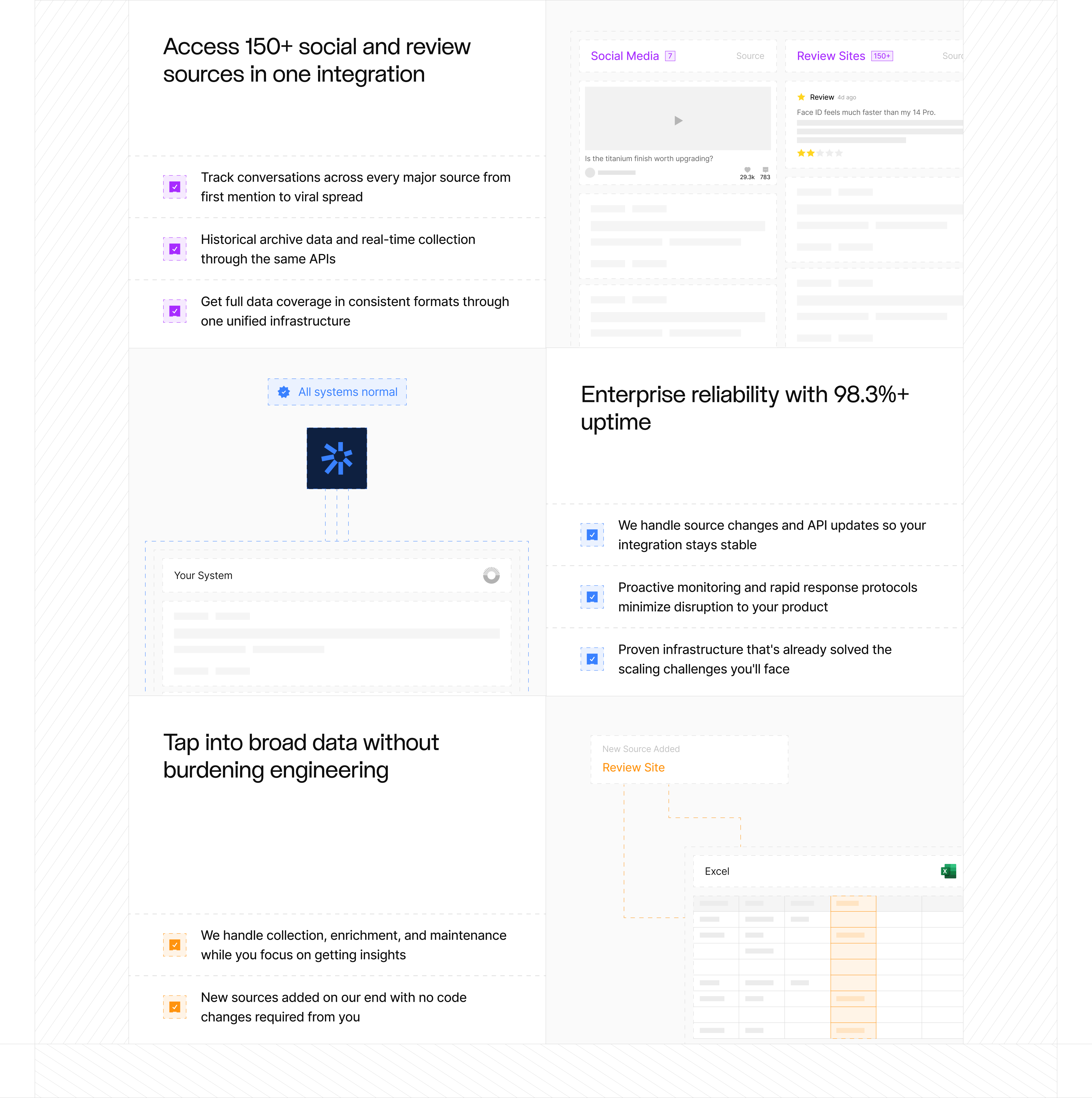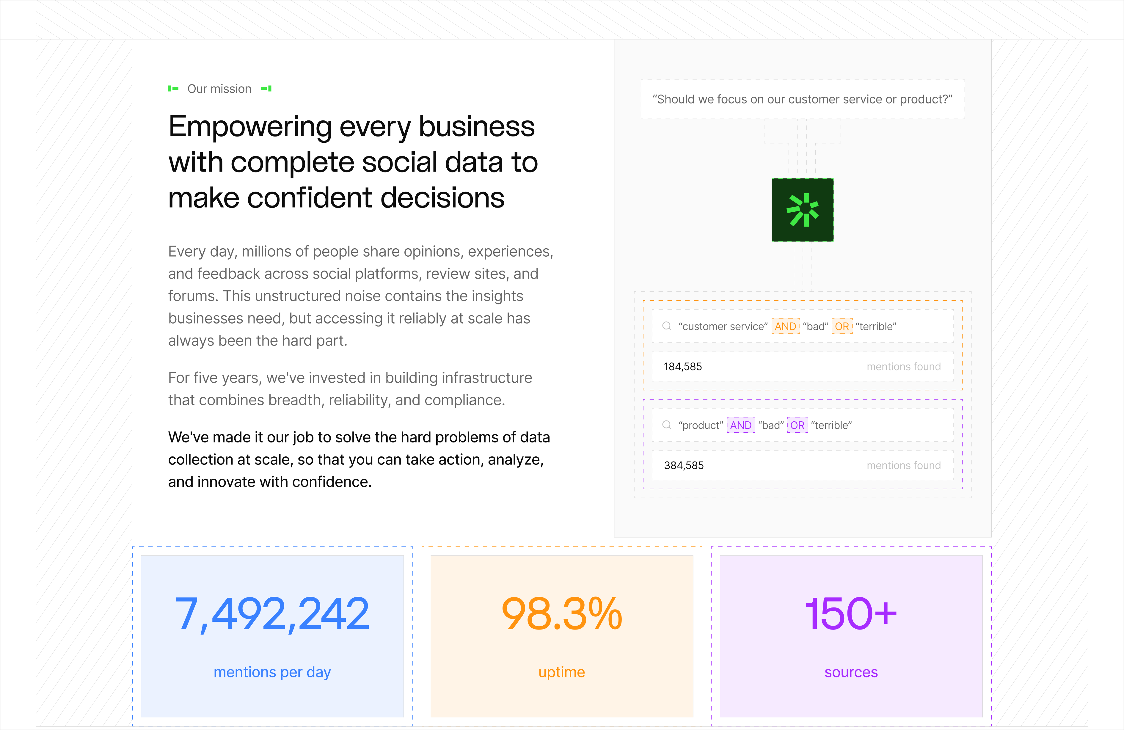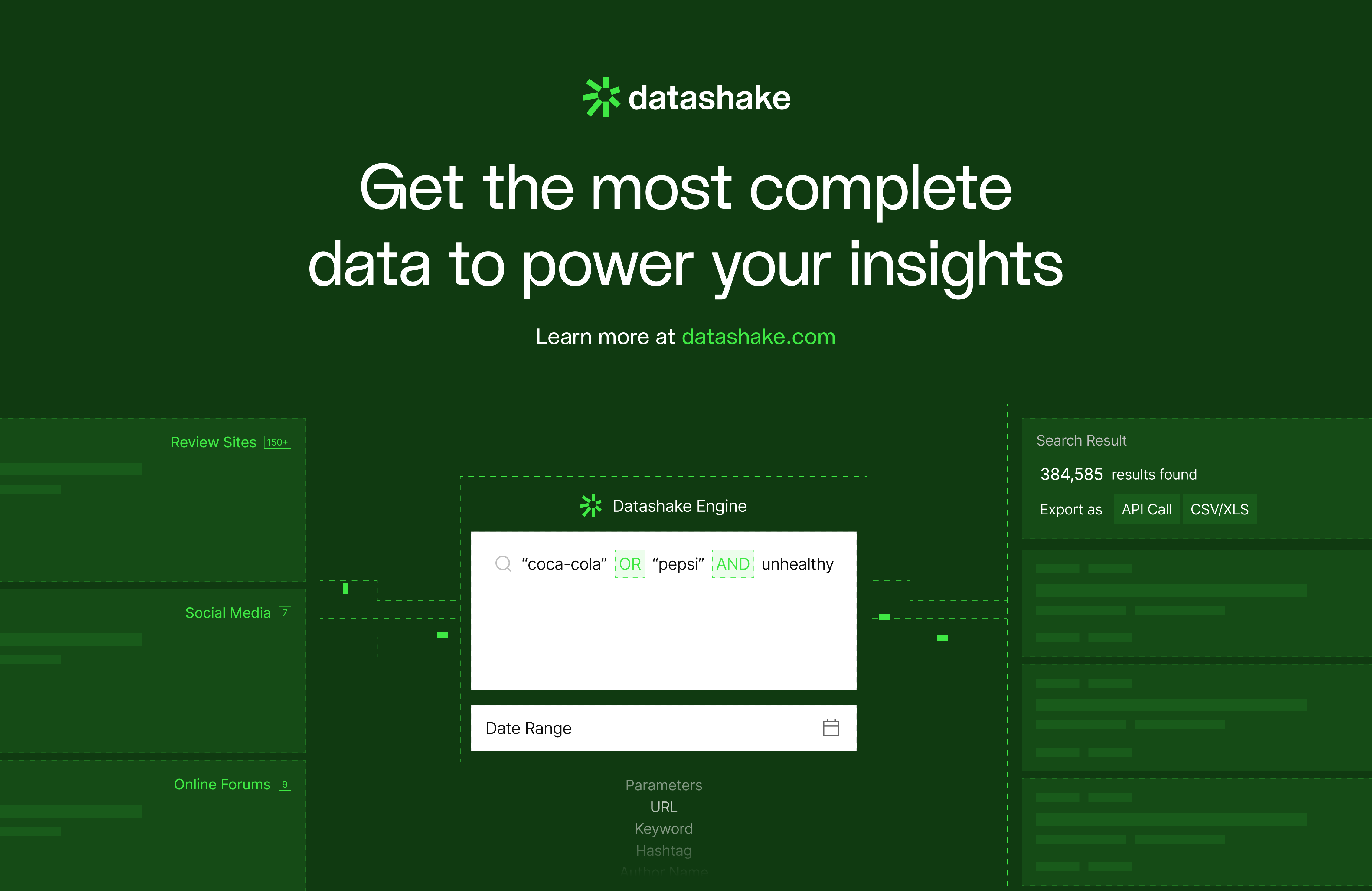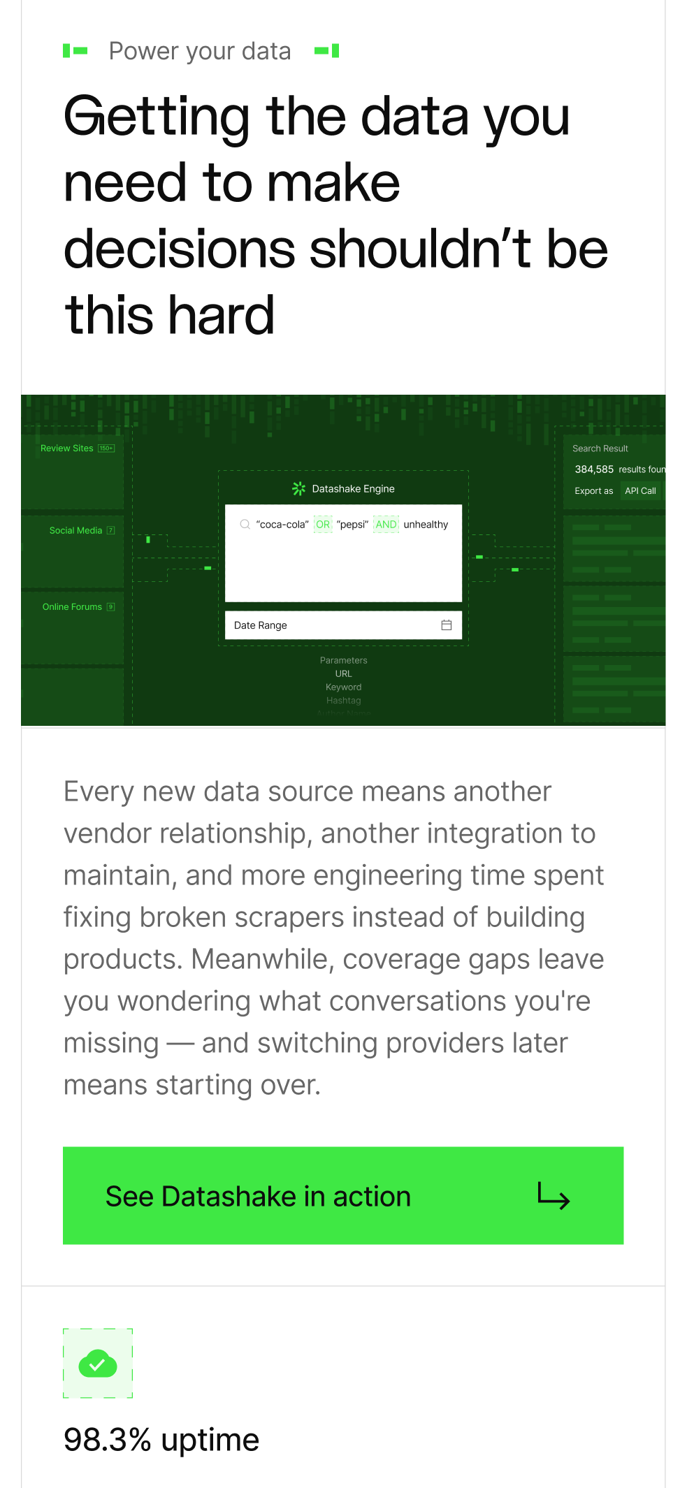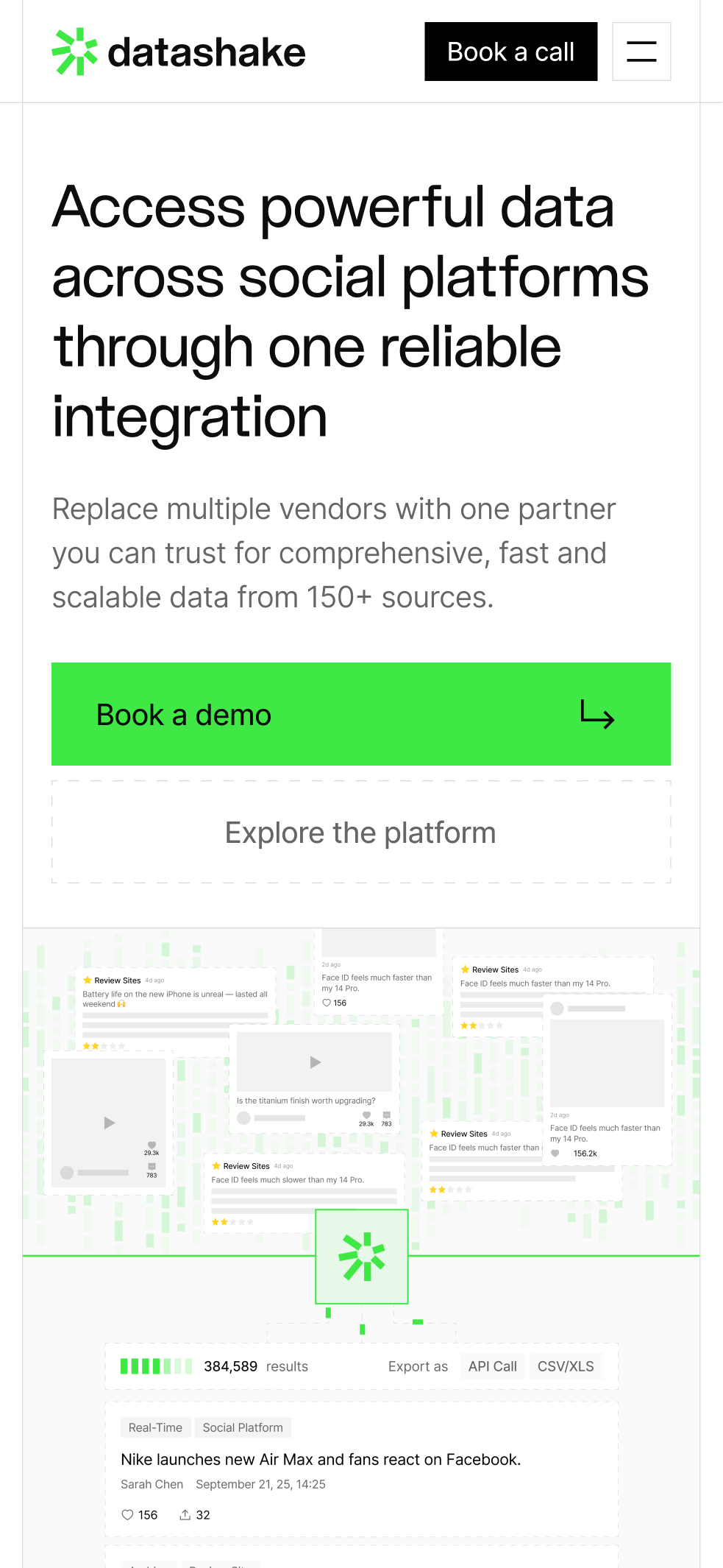 Datashake provides powerful social data intelligence across 150+ platforms—helping global brands monitor trends, manage reputation, and drive marketing decisions with real-time insights. The existing identity felt dated and didn't reflect the scale or technical depth of what they'd built. We rebuilt everything from the ground up, starting with logo and branding which we then implemented into a product first website design.