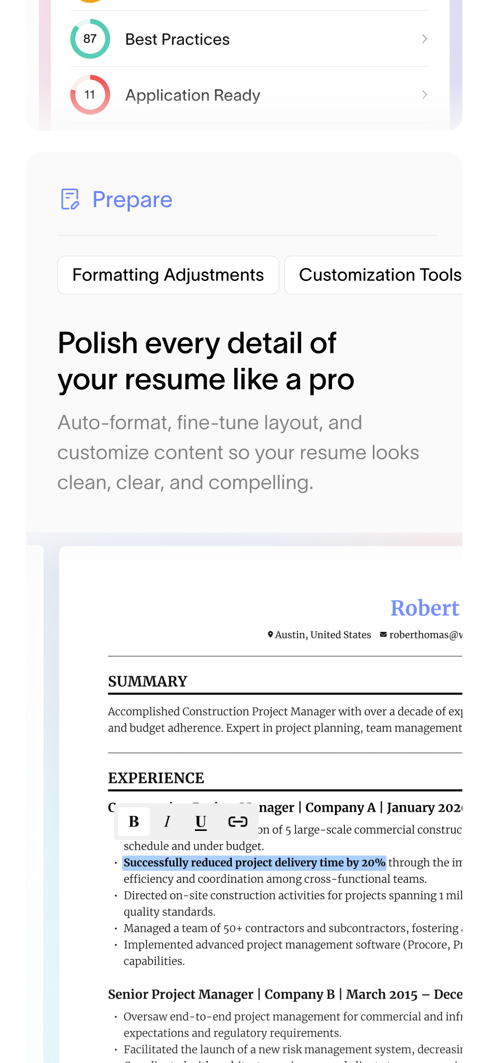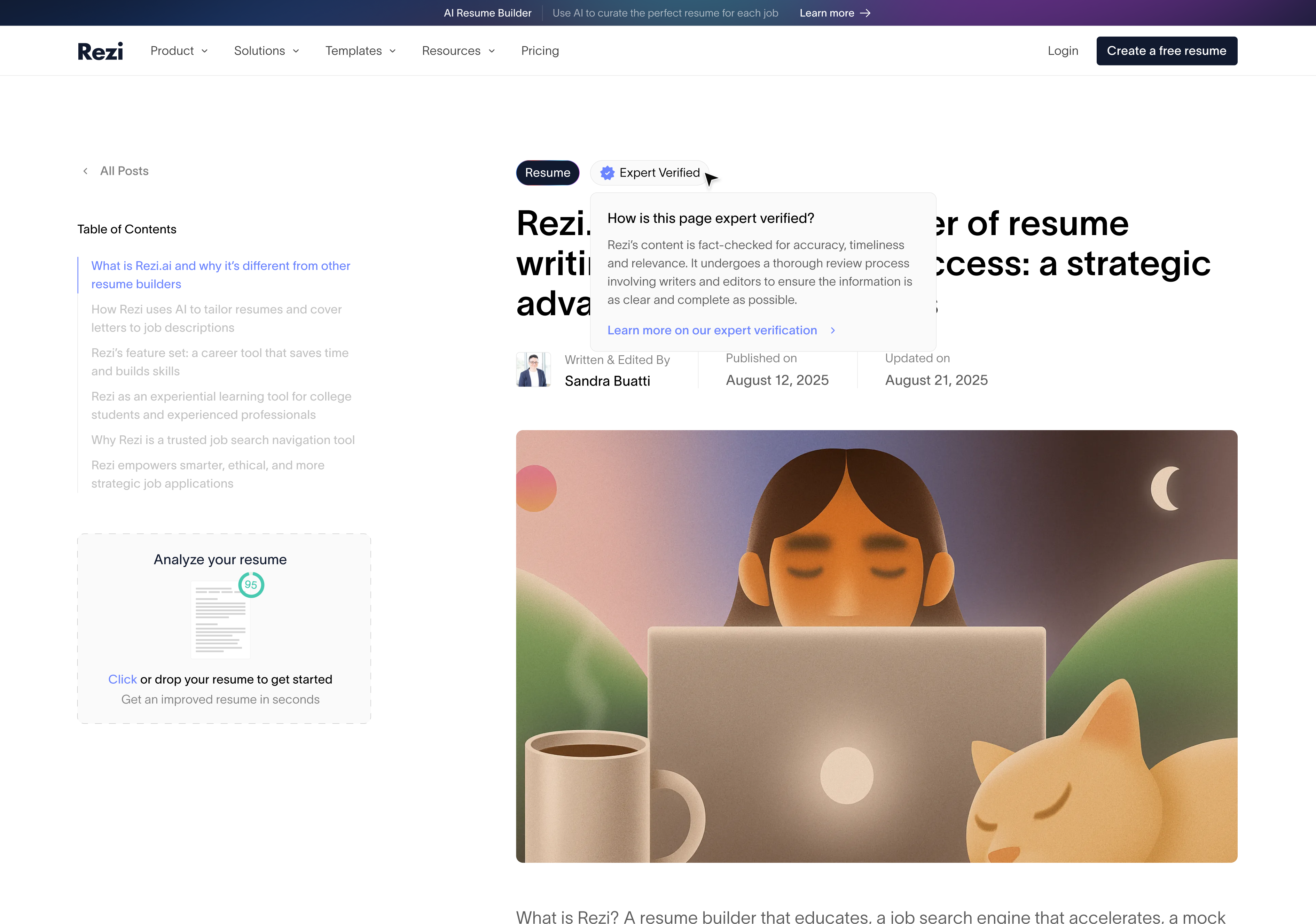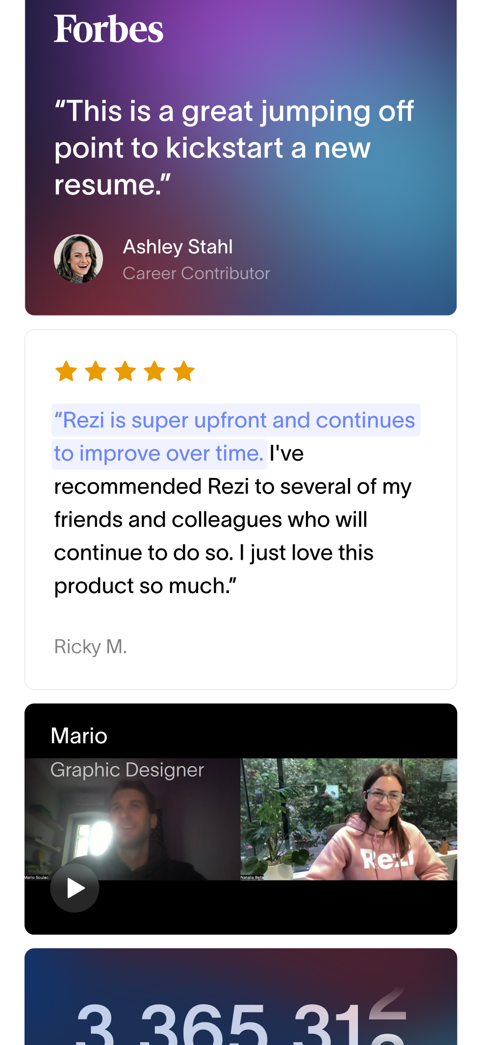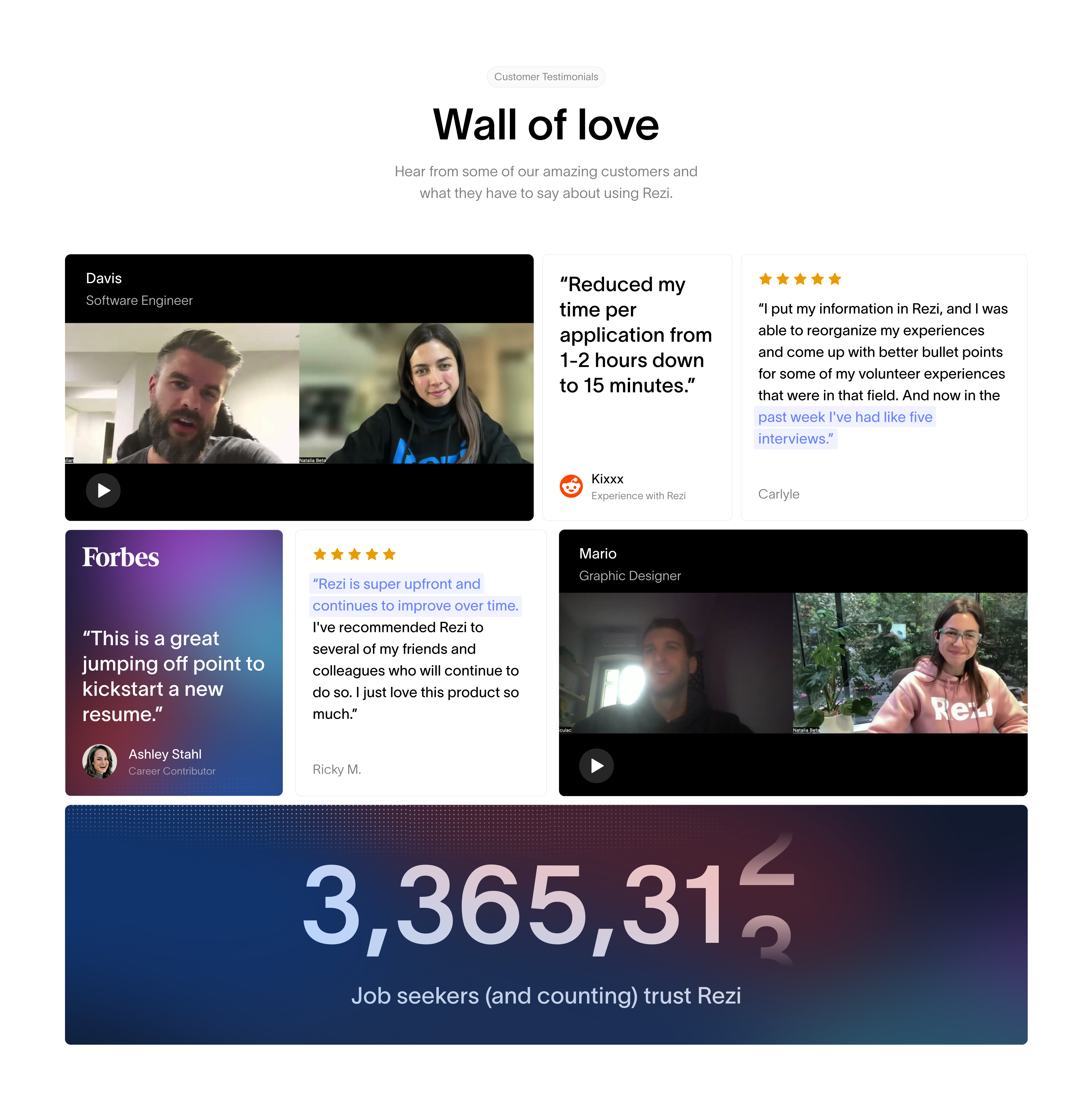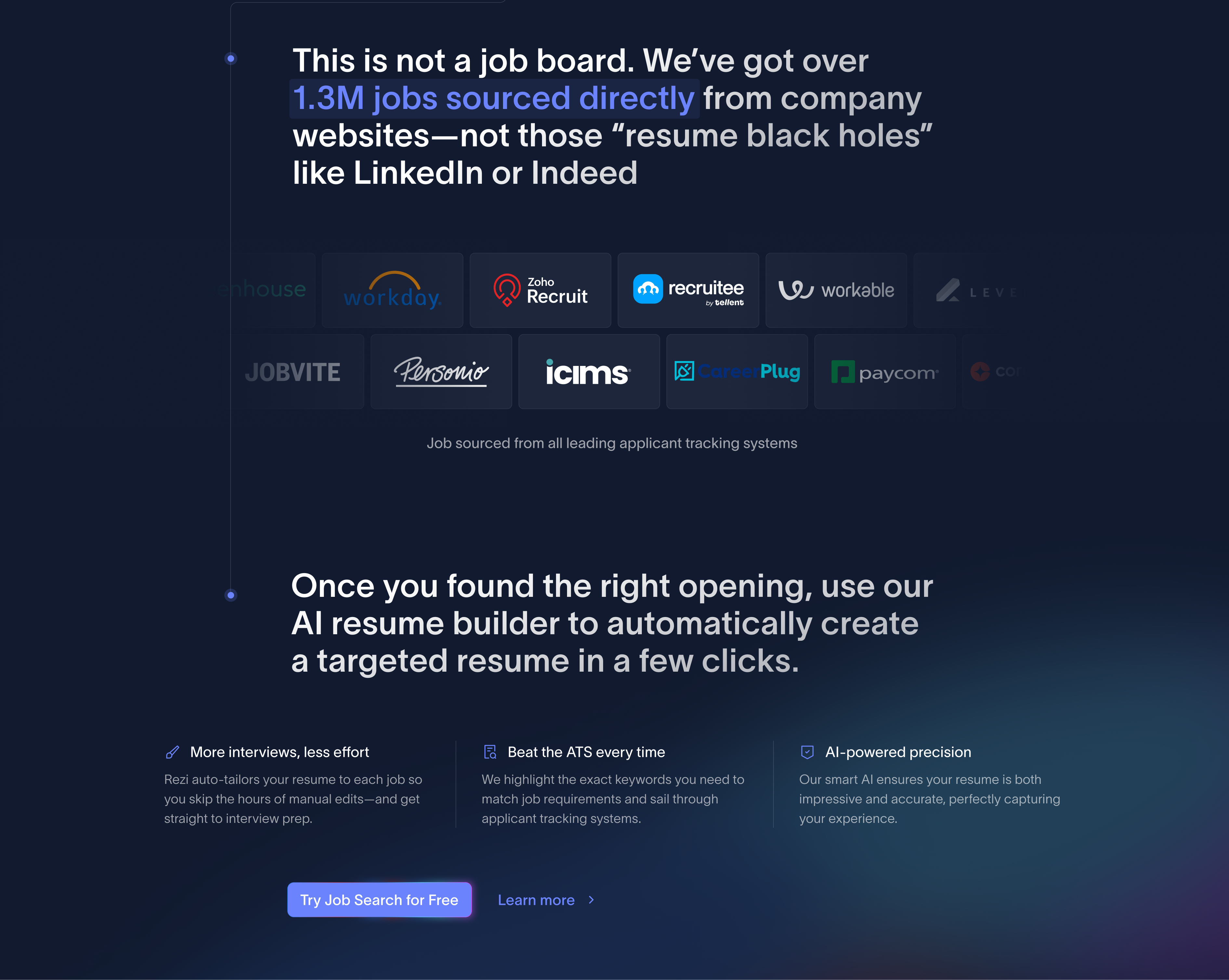 Rezi is an AI-powered resume builder trusted by over 3 million job seekers. Their platform automates resume creation, optimization, and formatting, helping people land jobs faster. Rezi needed a website redesign that matched the sophistication of their product. The existing site worked, but the visual execution didn't reflect how powerful and polished their platform had become. We used clean layouts, deliberate pacing in our custom animations, and strategic use of social proof to reinforce trust in their product.