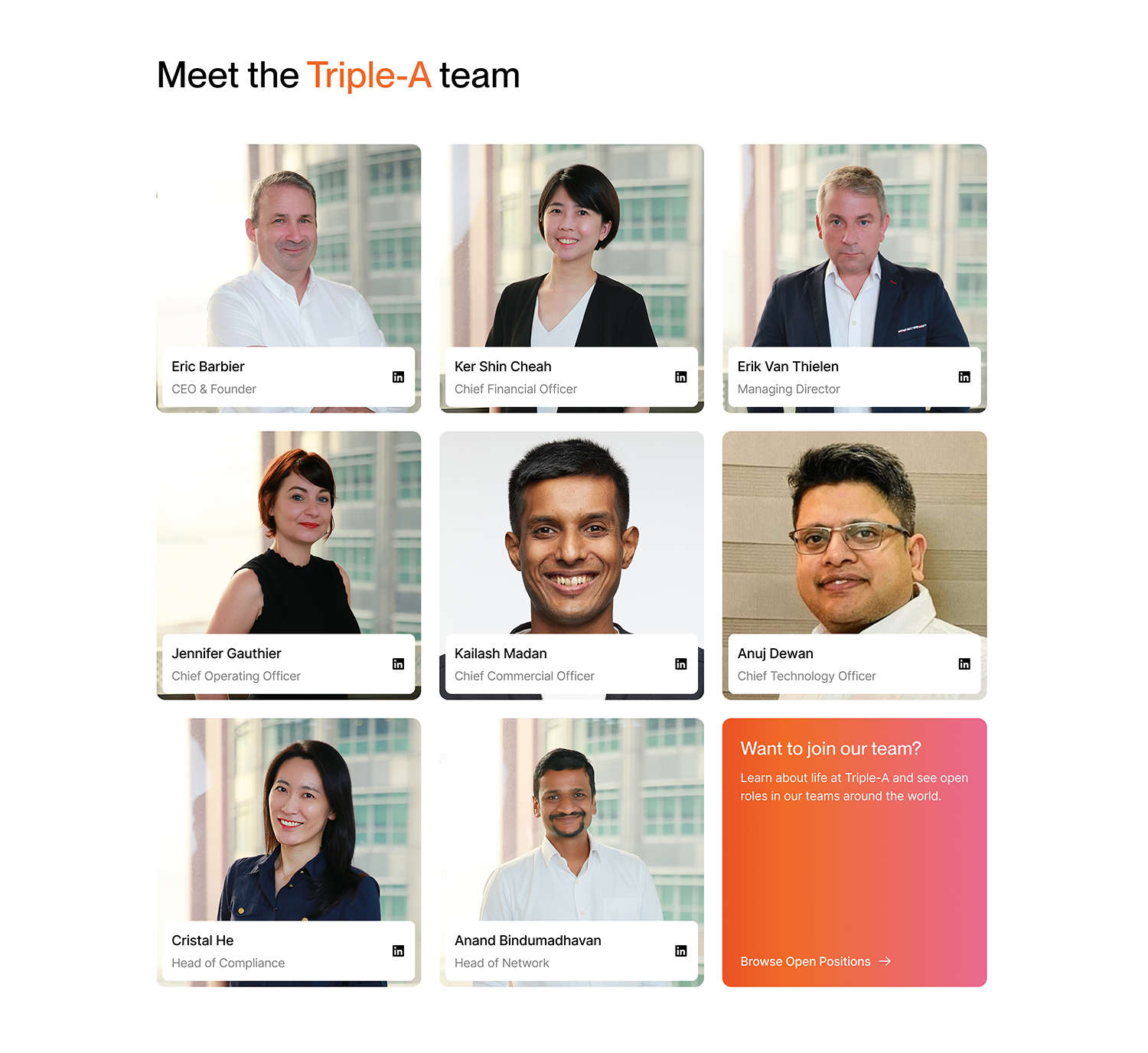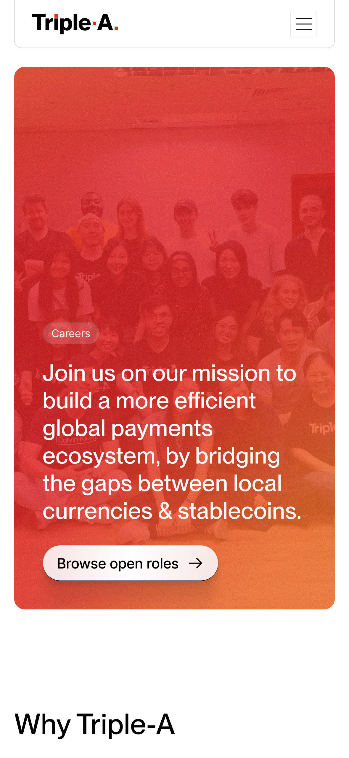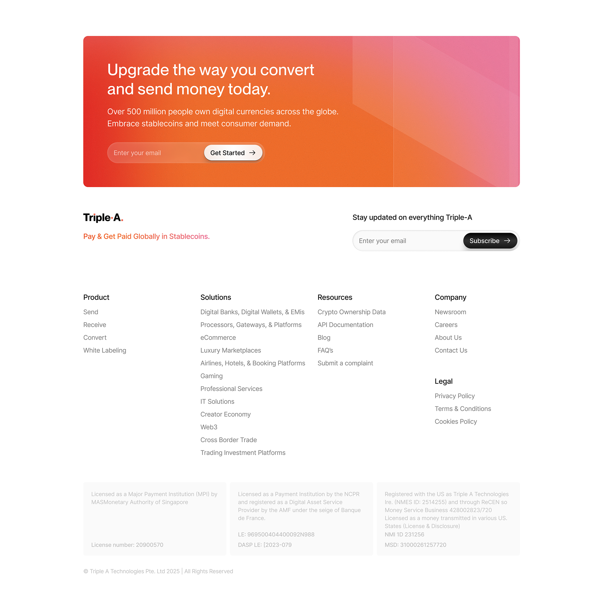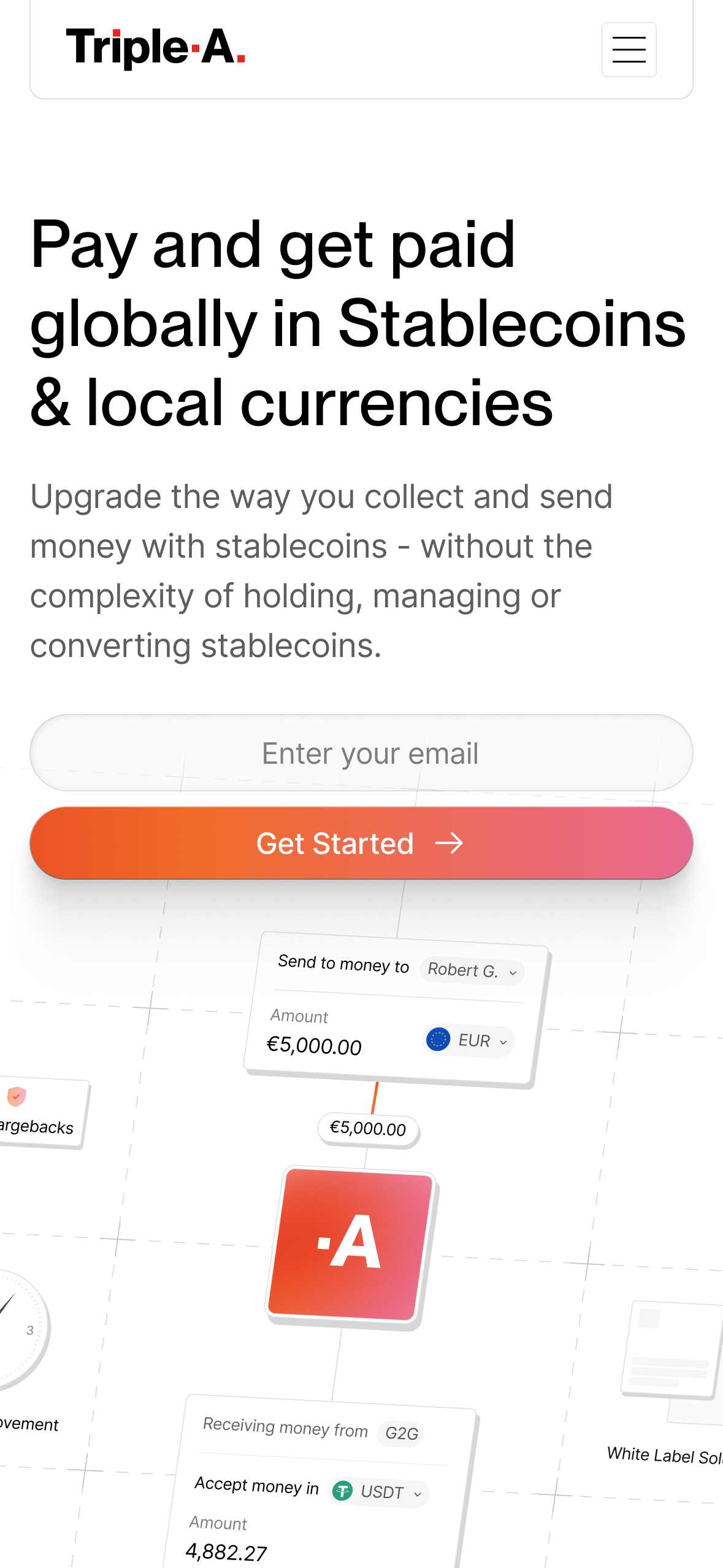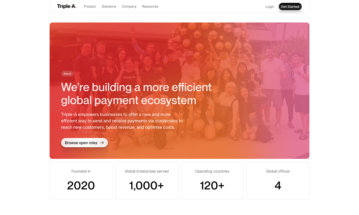 Triple-A empowers businesses to offer a new and more efficient way to send and receive payments via stablecoins to reach new customers, boost revenue, and optimize costs. We worked on a complete brand refresh — introducing a new logo refinement, an updated typography system, and a fresh set of colors. The web design emphasized trust and impact through strategic use of whitespace, a clean visual hierarchy, and social proof.